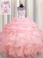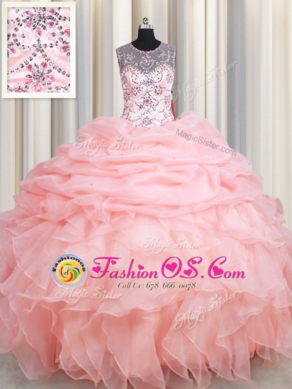 Home >  Quinceanera Dresses >  Fast Delivery Quinceanera Dresses > Scoop Floor Length Baby Pink 15th Birthday Dress Organza Sleeveless Beading and Ruffles and Pick Ups