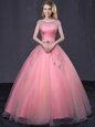 Scoop Floor Length Ball Gowns Cap Sleeves Watermelon Red Sweet 16 Dress Lace Up