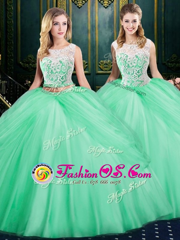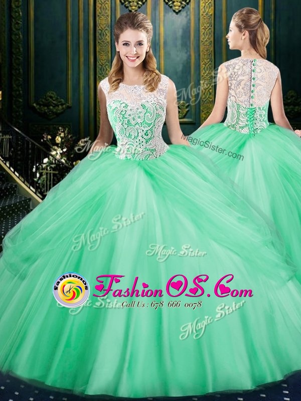 Scoop Floor Length Zipper Quinceanera Dresses Apple Green and In for Military Ball and Sweet 16 and Quinceanera with Lace and Pick Ups