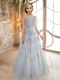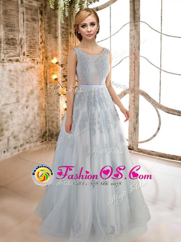 Scoop Grey A-line Appliques Prom Evening Gown Lace Up Tulle Sleeveless Floor Length