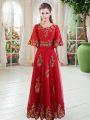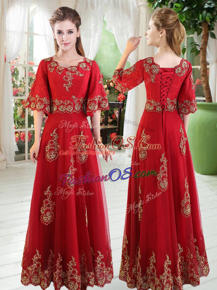 Scoop Half Sleeves Homecoming Dress Floor Length Lace Red Tulle