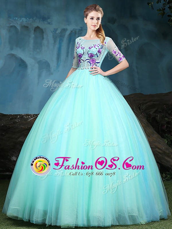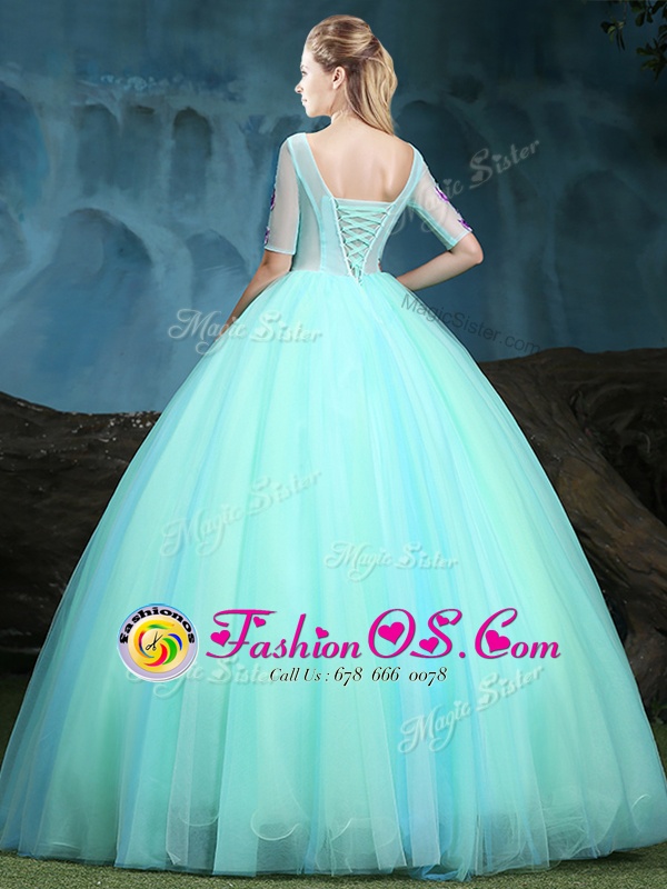 Scoop Half Sleeves Lace Up Floor Length Appliques Sweet 16 Dresses