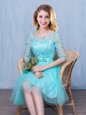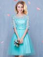 Scoop Knee Length Aqua Blue Dama Dress for Quinceanera Tulle Half Sleeves Lace and Appliques and Bowknot