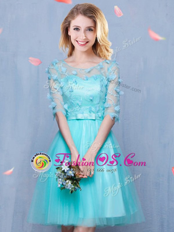Home >  Special Occasion Dresses >  New Style Dama Dresses > Scoop Knee Length Aqua Blue Dama Dress for Quinceanera Tulle Half Sleeves Lace and Appliques and Bowknot