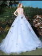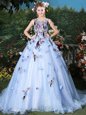 Scoop Light Blue Sleeveless Brush Train Appliques Floor Length Sweet 16 Quinceanera Dress