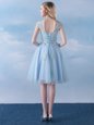 Home >  Bridesmaid Dresses >  Elegant Bridesmaid Dresses > Scoop Light Blue Tulle Lace Up Wedding Party Dress Cap Sleeves Knee Length Appliques and Belt