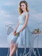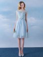 Scoop Light Blue Tulle Lace Up Wedding Party Dress Cap Sleeves Knee Length Appliques and Belt