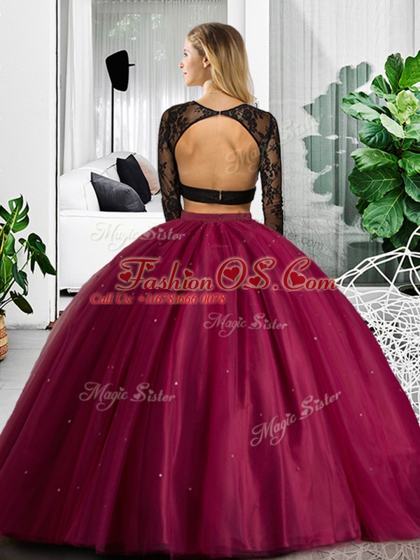 Silhouette: Two Pieces Neckline: scoop Sleeve Length: long sleeves Hemline/Train: floor length Back Detail: backless Embellishment: lace,ruching Fabric: tulle Shown Color: dark green(Color & Style representation may vary by monitor.) Occasion: military ball,sweet 16,quinceanera Season: spring,summer,fall,winter Fully Lined: Yes Built-In Bra: Yes
