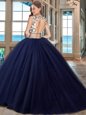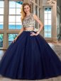 Scoop Navy Blue Tulle Backless Sweet 16 Dresses Cap Sleeves With Brush Train Beading