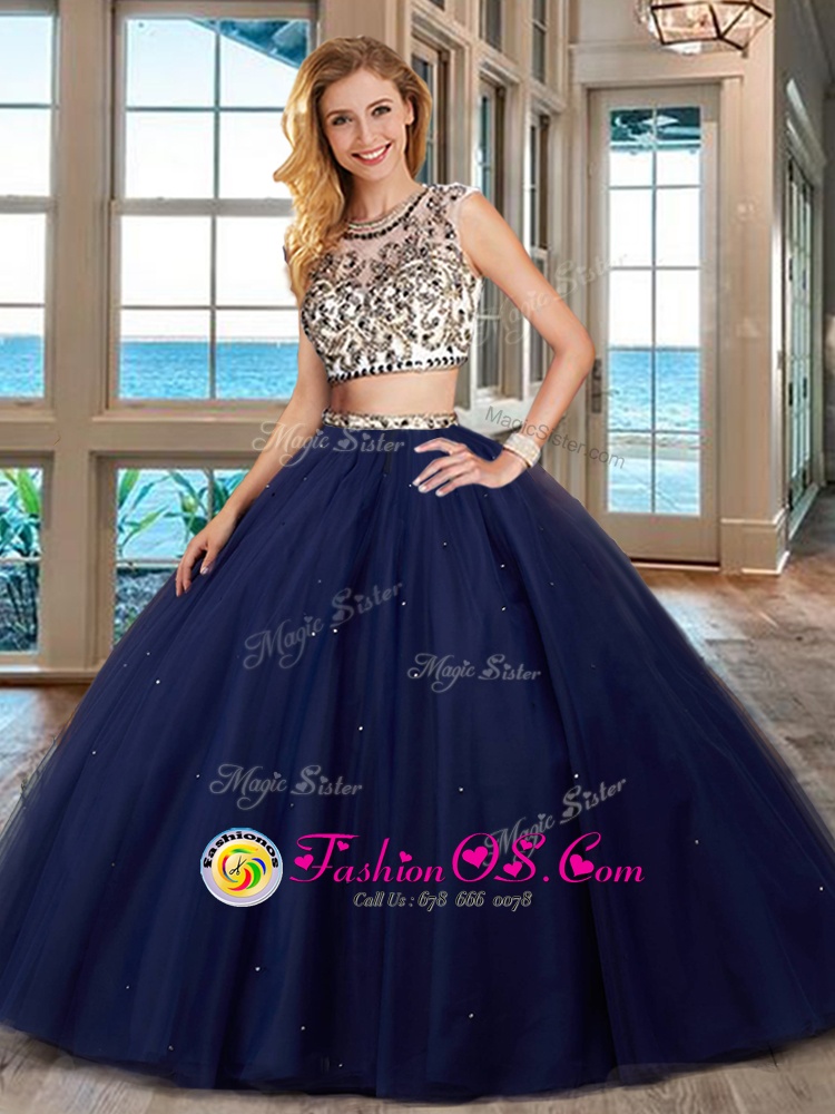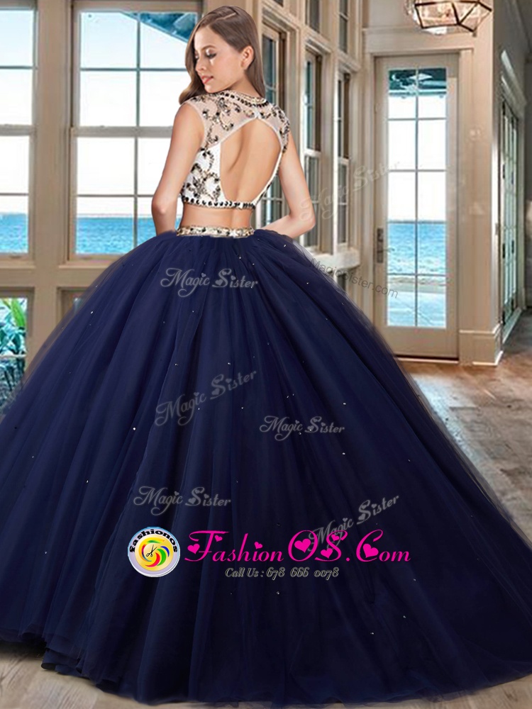 Home >  Quinceanera Dresses >  Fast Delivery Quinceanera Dresses > Scoop Navy Blue Tulle Backless Sweet 16 Dresses Cap Sleeves With Brush Train Beading