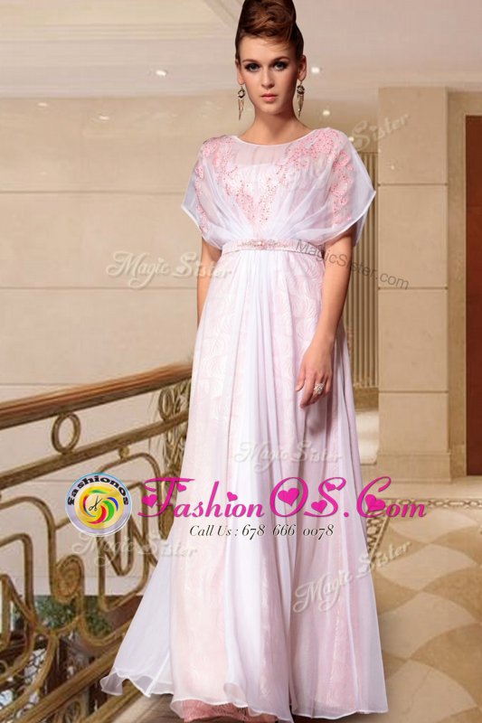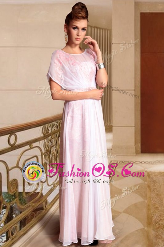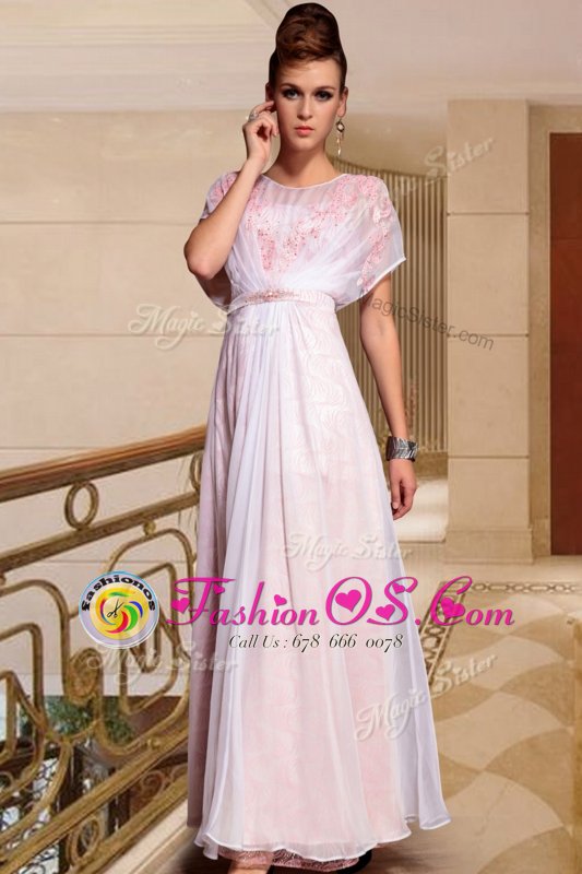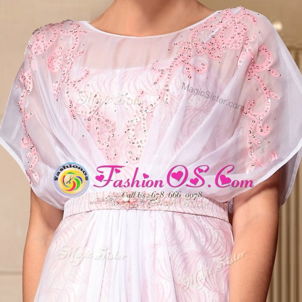 Scoop Pink Chiffon Side Zipper Dress for Prom Cap Sleeves Ankle Length Beading