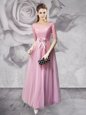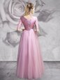 Scoop Pink Half Sleeves Floor Length Lace and Ruching and Bowknot Lace Up Prom Dresses