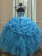 Home >  Quinceanera Dresses >  Fast Delivery Quinceanera Dresses > Scoop See Through Baby Blue Sleeveless Beading and Ruffles and Pick Ups Floor Length Quinceanera Gowns