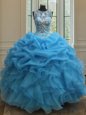Scoop See Through Baby Blue Sleeveless Beading and Ruffles and Pick Ups Floor Length Quinceanera Gowns
