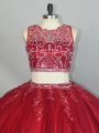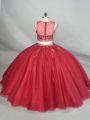 Scoop Sleeveless 15th Birthday Dress Floor Length Beading and Appliques Red Tulle