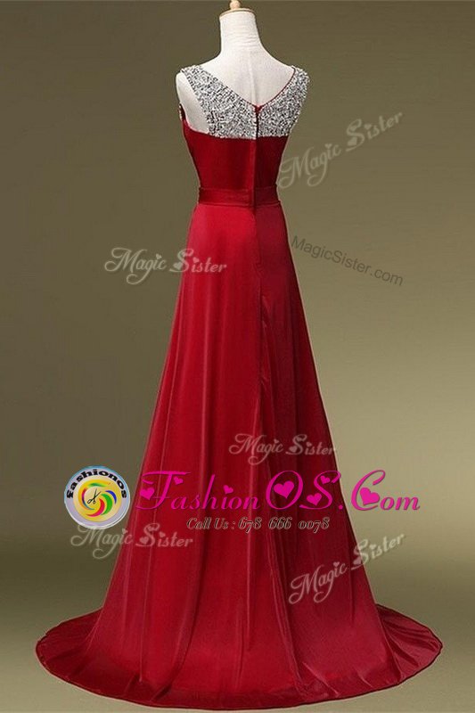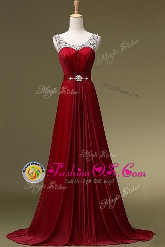 Scoop Sleeveless Brush Train Zipper Beading and Belt Prom Dresses