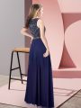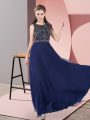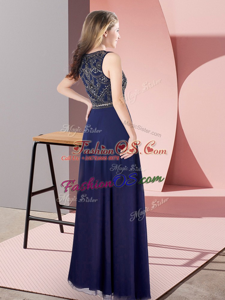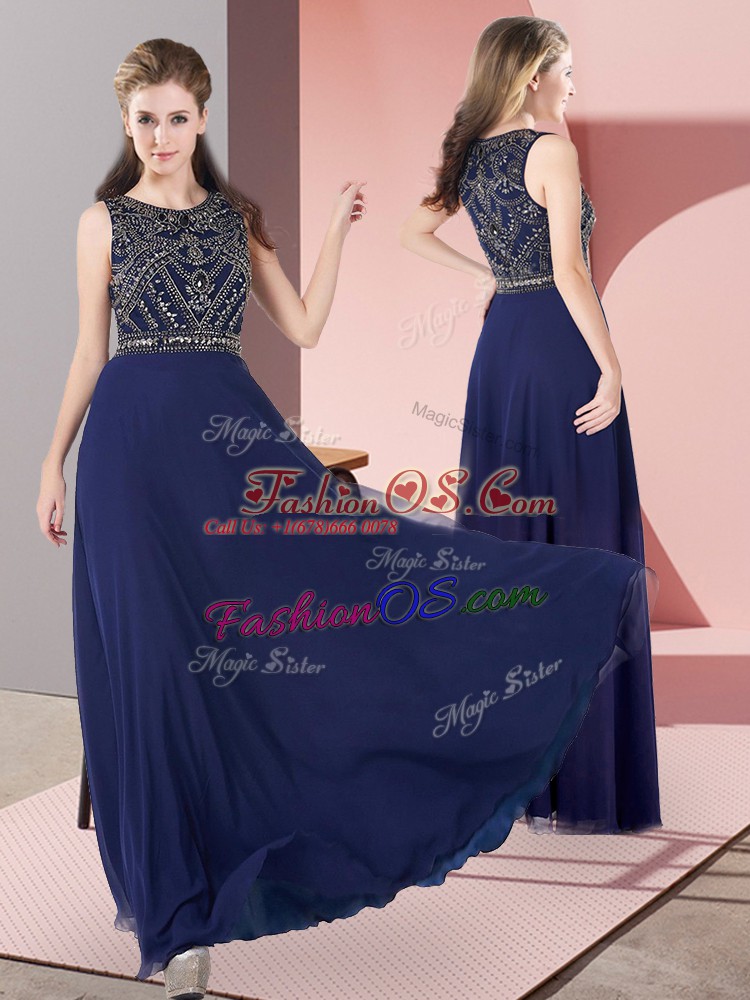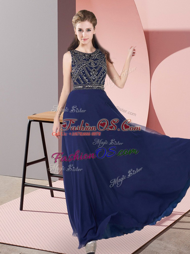 Scoop Sleeveless Evening Dress Floor Length Beading Navy Blue Chiffon