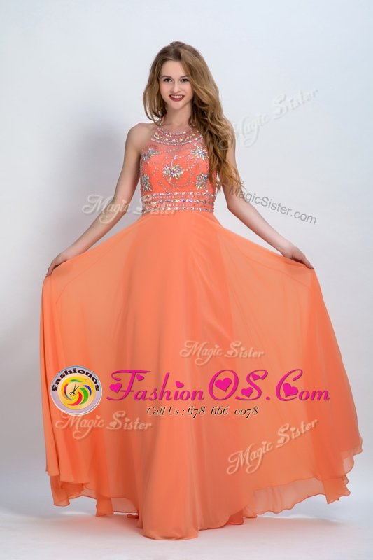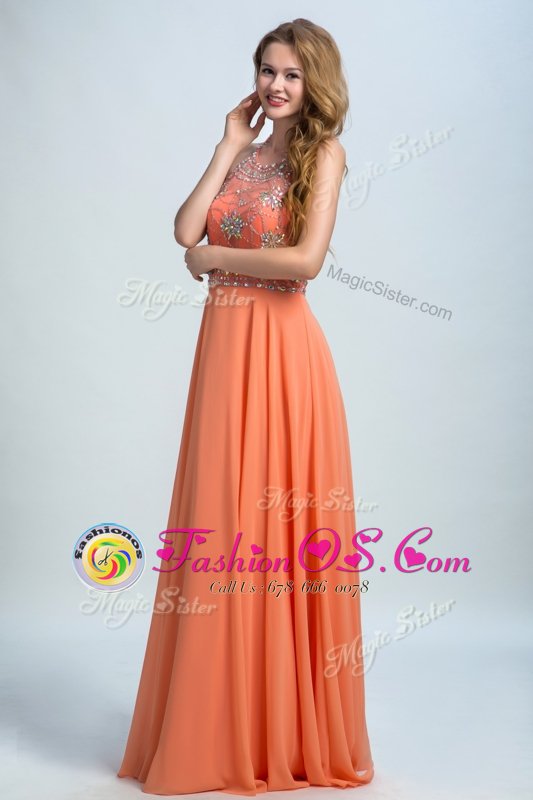 Scoop Sleeveless Floor Length Beading Orange Chiffon