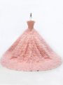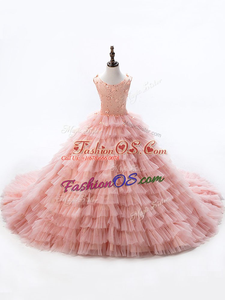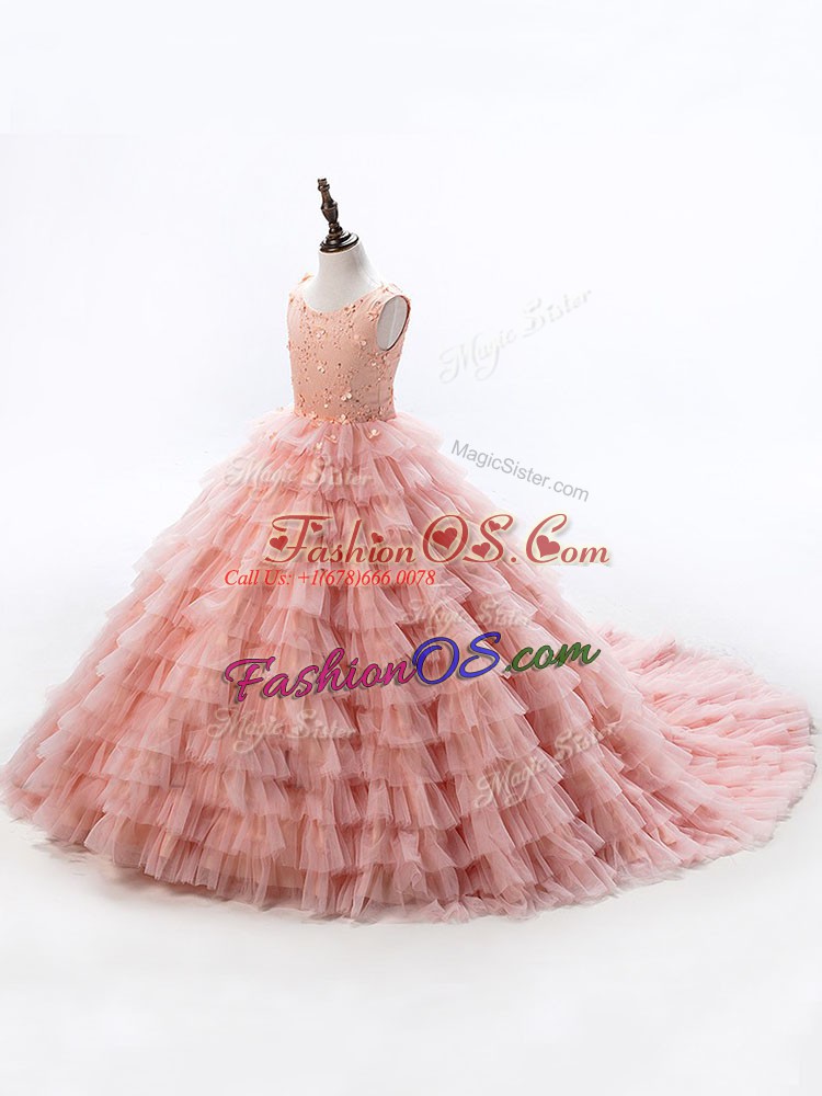 Scoop Sleeveless Kids Formal Wear Court Train Beading and Ruffled Layers Pink