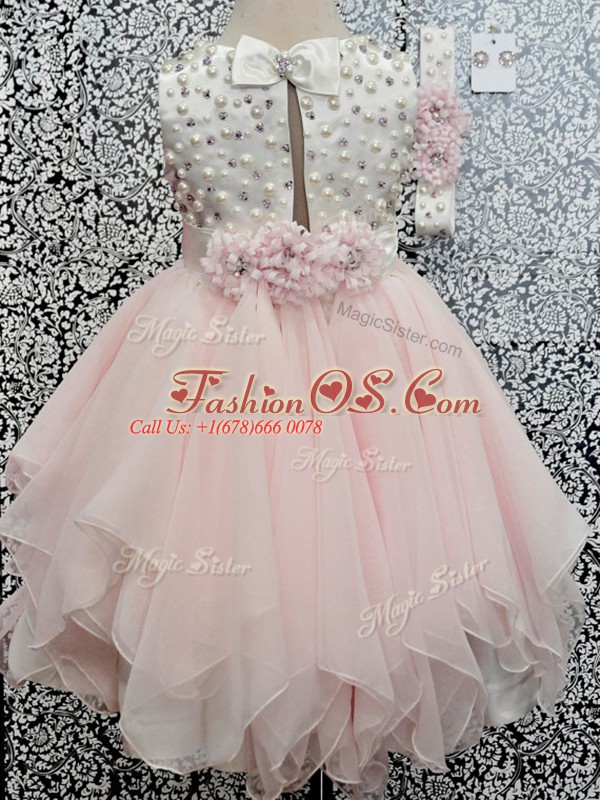 Scoop Sleeveless Kids Pageant Dress Asymmetrical Beading and Hand Made Flower Baby Pink Chiffon