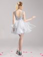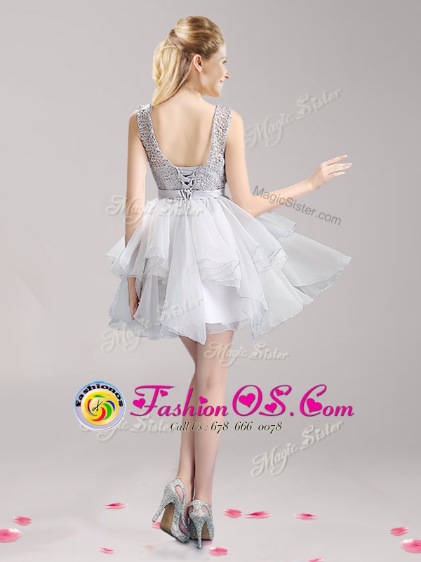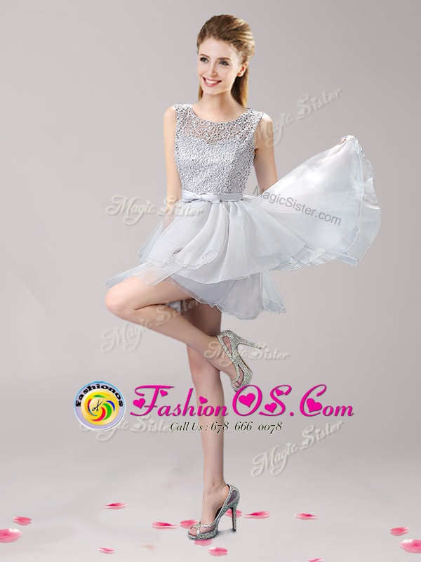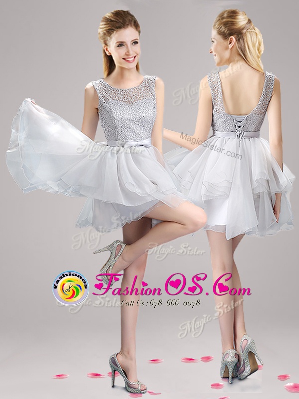 Scoop Sleeveless Mini Length Lace and Ruffles and Bowknot Lace Up Dress for Prom with Grey