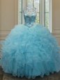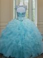 Home >  Quinceanera Dresses >  15 Quinceanera Dresses > Scoop Sleeveless Organza Floor Length Lace Up Quince Ball Gowns in Aqua Blue for with Beading and Ruffles