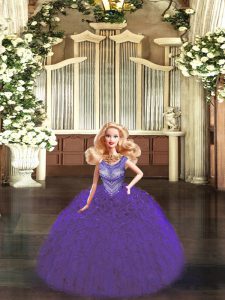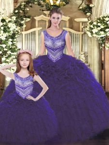 Scoop Sleeveless Quince Ball Gowns Floor Length Beading and Ruffles Dark Purple Tulle