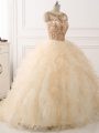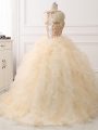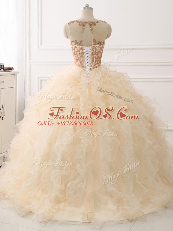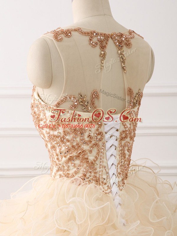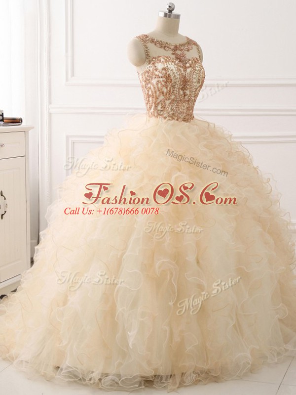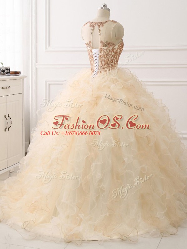 Scoop Sleeveless Sweep Train Lace Up Quinceanera Gowns Champagne Organza
