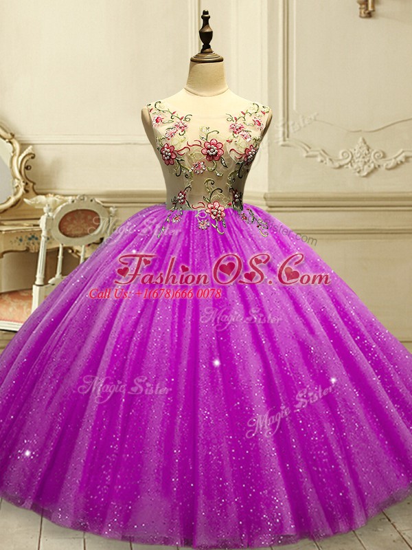 Scoop Sleeveless Tulle Ball Gown Prom Dress Appliques and Sequins Lace Up