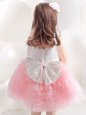 Home >  Special Occasion Dresses >  Cheap Flower Girl Dresses > Scoop Sleeveless Tulle Knee Length Side Zipper Flower Girl Dresses for Less in Pink And White for with Ruffled Layers and Bowknot and Hand Made Flower