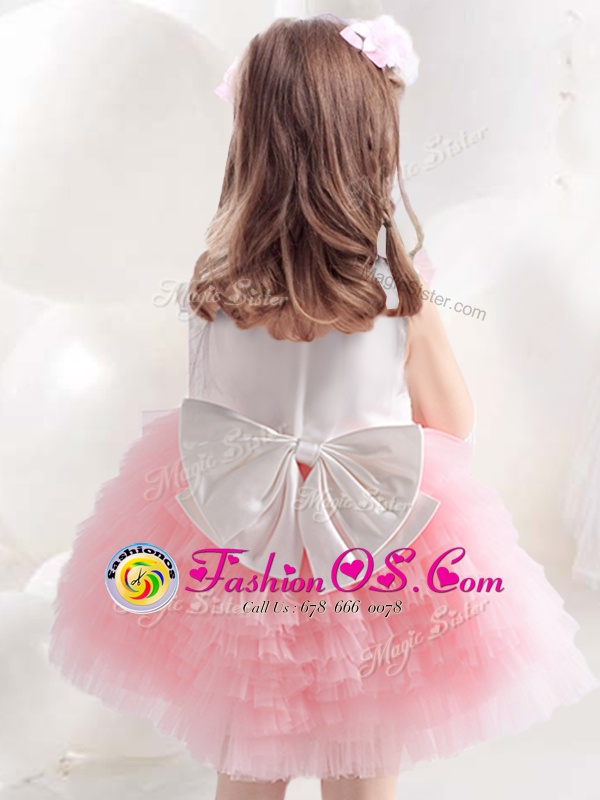 Scoop Sleeveless Tulle Knee Length Side Zipper Flower Girl Dresses for Less in Pink And White for with Ruffled Layers and Bowknot and Hand Made Flower