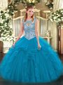 Home >  Quinceanera Dresses >  Beautiful Quinceanera Dresses > Scoop Sleeveless Vestidos de Quinceanera Floor Length Beading and Ruffles Blue Tulle