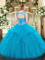 Scoop Sleeveless Vestidos de Quinceanera Floor Length Beading and Ruffles Blue Tulle