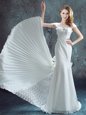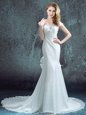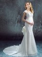 Home >  Wedding Dresses >  Low Cost Wedding Dresses > Scoop White Mermaid Lace and Bowknot and Pleated Wedding Dresses Zipper Chiffon and Lace Short Sleeves With Train