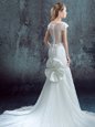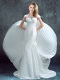 Scoop White Mermaid Lace and Bowknot and Pleated Wedding Dresses Zipper Chiffon and Lace Short Sleeves With Train