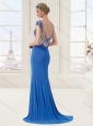 See Through Applique and Beaded Blue Evening Dress with Brush Train