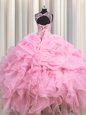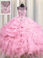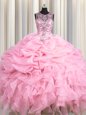 See Through Baby Pink Scoop Lace Up Beading and Ruffles and Pick Ups Quince Ball Gowns Sleeveless