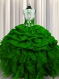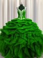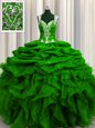 Home >  Quinceanera Dresses >  Perfect Quinceanera Dresses > See Through Back Sleeveless Floor Length Beading and Ruffles and Sequins and Pick Ups Zipper Sweet 16 Dress with Green
