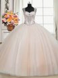 See Through Back Zipper Up Straps Cap Sleeves Quinceanera Gowns Floor Length Beading Peach Tulle