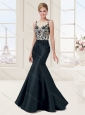 See Through Bateau Scoop Black Evening Dress with Beading and Applique