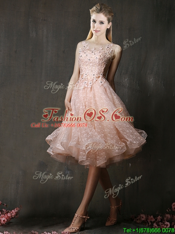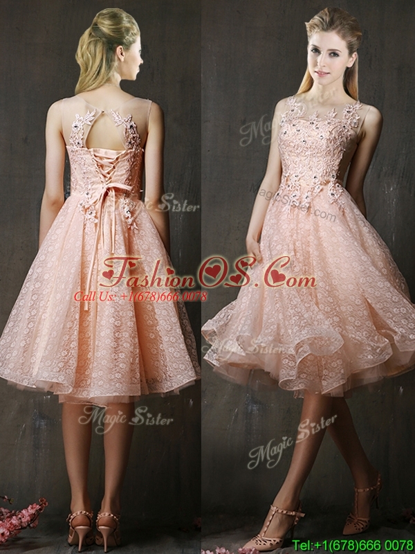 See Through Beaded and Applique Peach Bridesmaid Dress with Polka Dot
