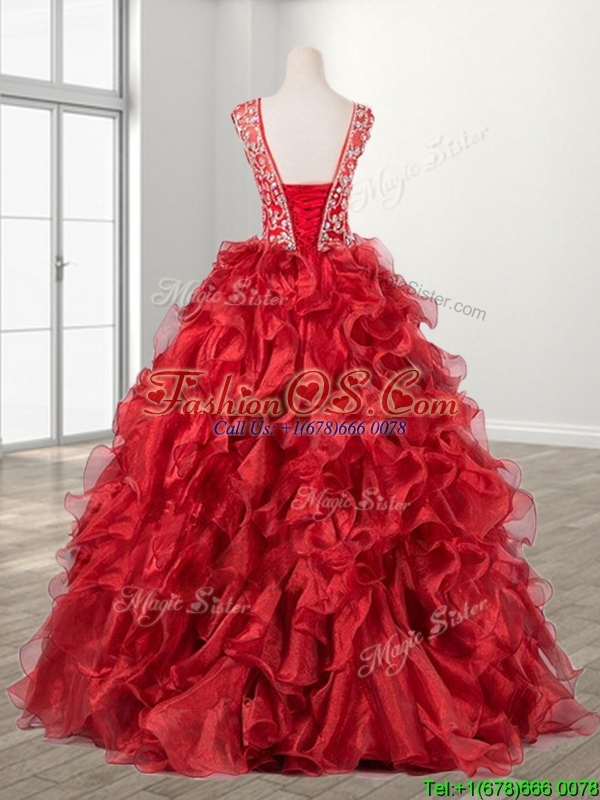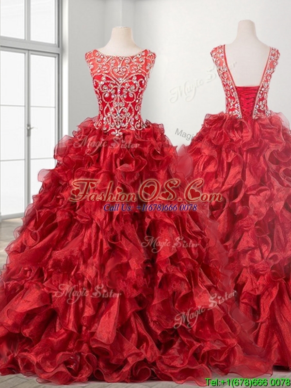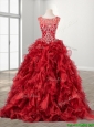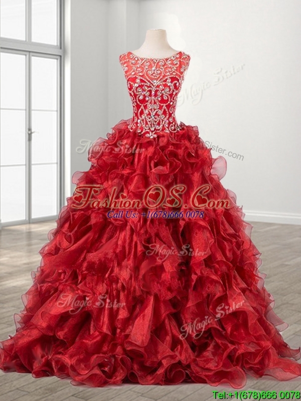 See Through Beaded Scoop Wine Red Quinceanera Dress with Brush Train