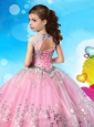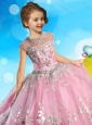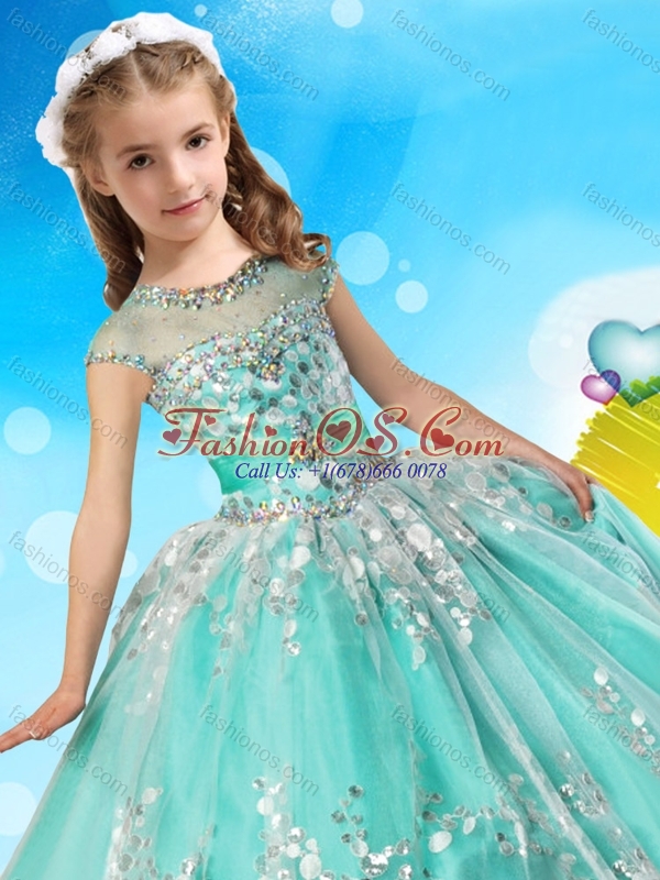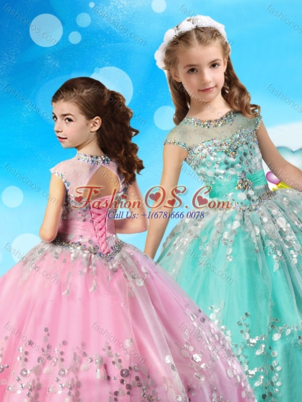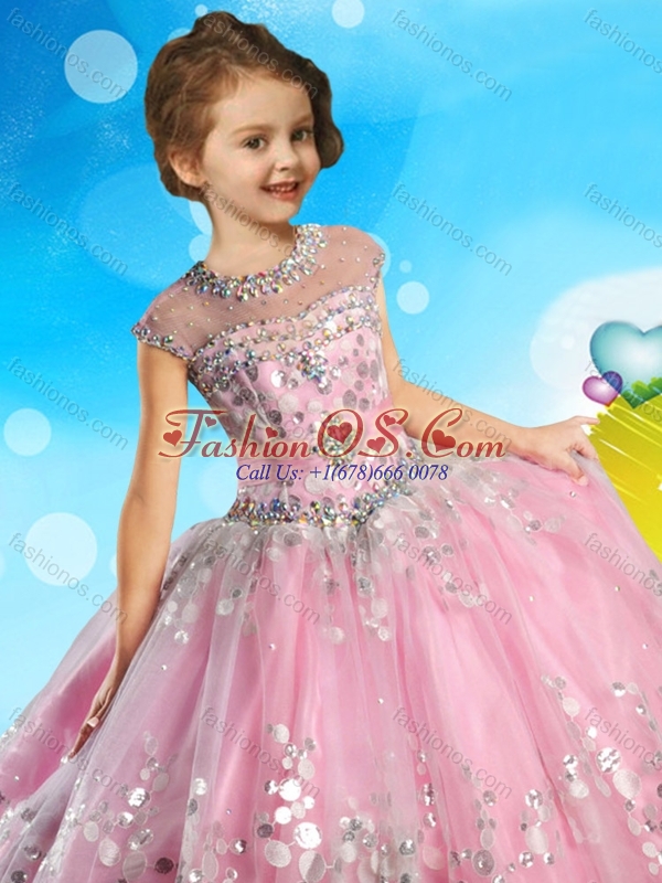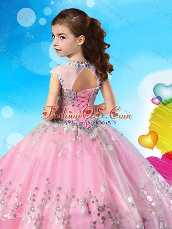 See Through Cap Sleeves Little Girl Pageant Dress with Beading and Appliques