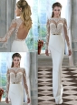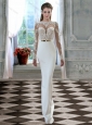 See Through Column Bateau Lace Open Back Wedding Dress with Long Sleeves