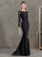 See Through Long Sleeves Mermaid Black Mother of the Bride Dress in Lace and Satin