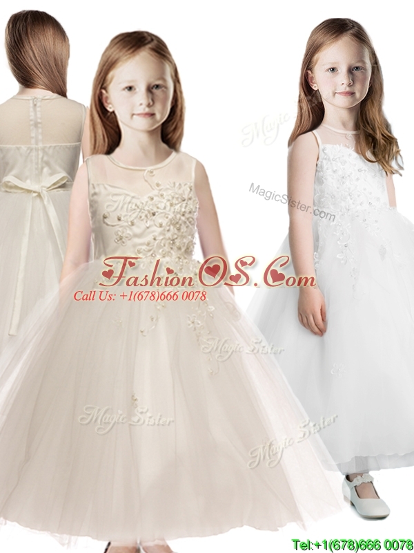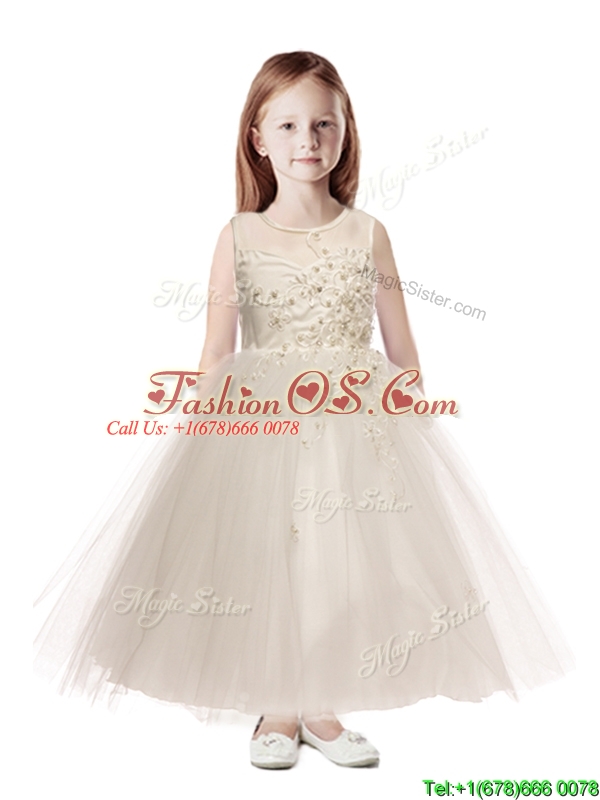 See Through Scoop Appliques Little Girl Pageant Dress in Champagne