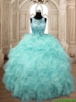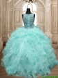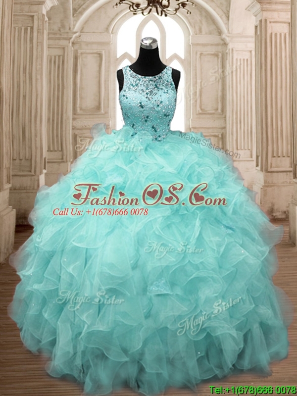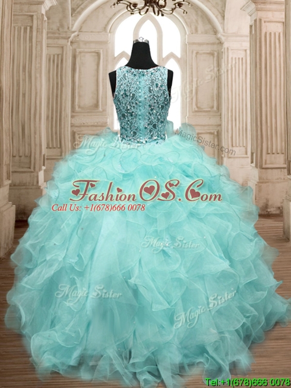 See Through Scoop Beading and Ruffles Quinceanera Dress in Aqua Blue