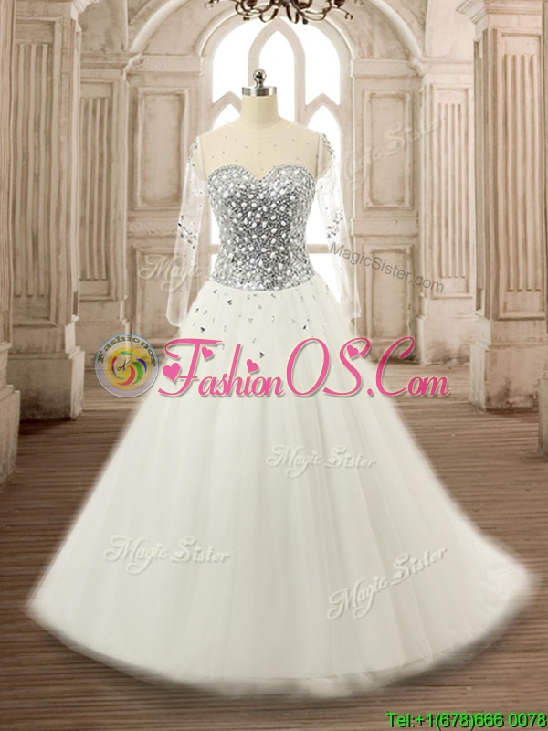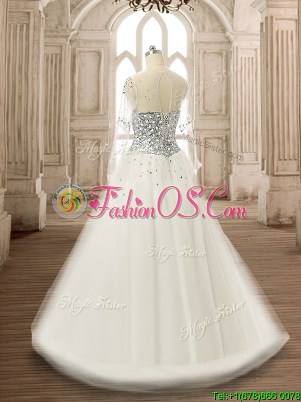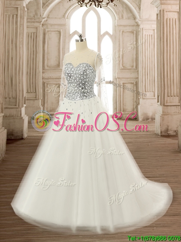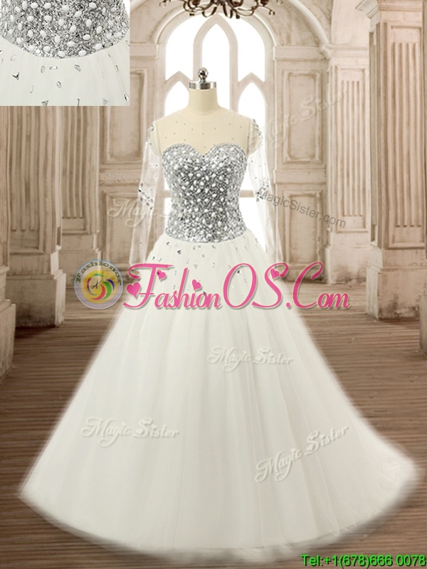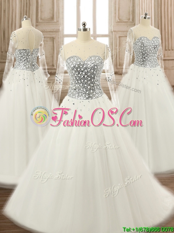 See Through Scoop Long Sleeves White Quinceanera Dress with Beading