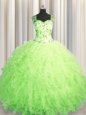 Home >  Quinceanera Dresses >  Puffy Quinceanera Dresses > See Through Zipper Up Green Straps Zipper Beading and Ruffles Sweet 16 Dresses Sleeveless