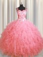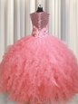 Home >  Quinceanera Dresses >  Luxurious Quinceanera Dresses > See Through Zipper Up Pink Sleeveless Floor Length Beading and Ruffles Zipper Quinceanera Gown